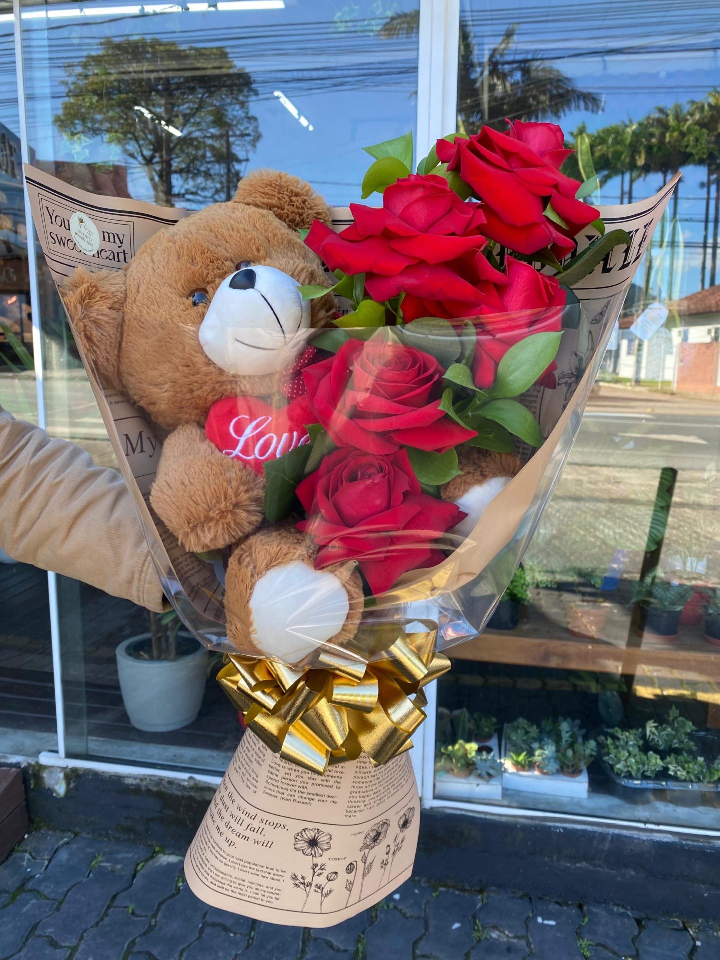Buquê super romântico composto por 5 rosas colombianas com ruscos e pelúcia de 30cm.