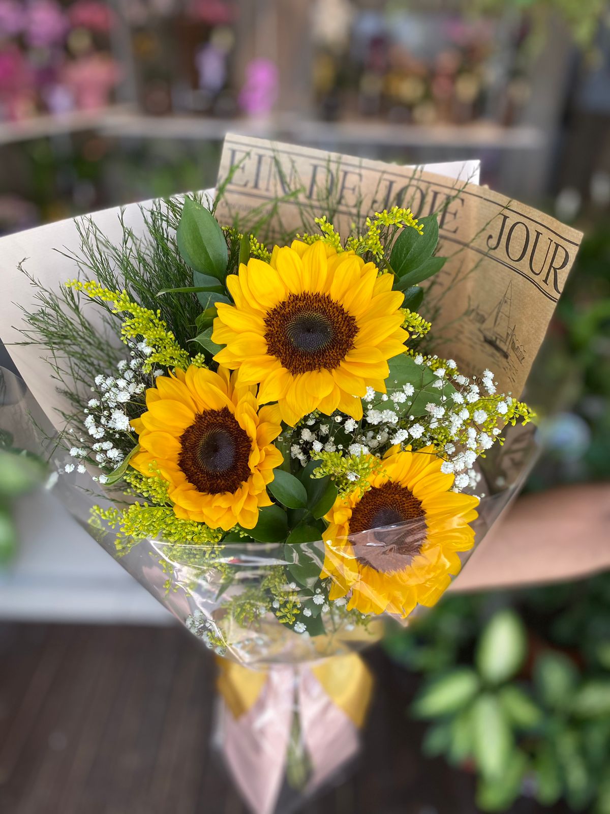 Mini buquê composto por 3 Girassóis , mosquitinhos e verdes.