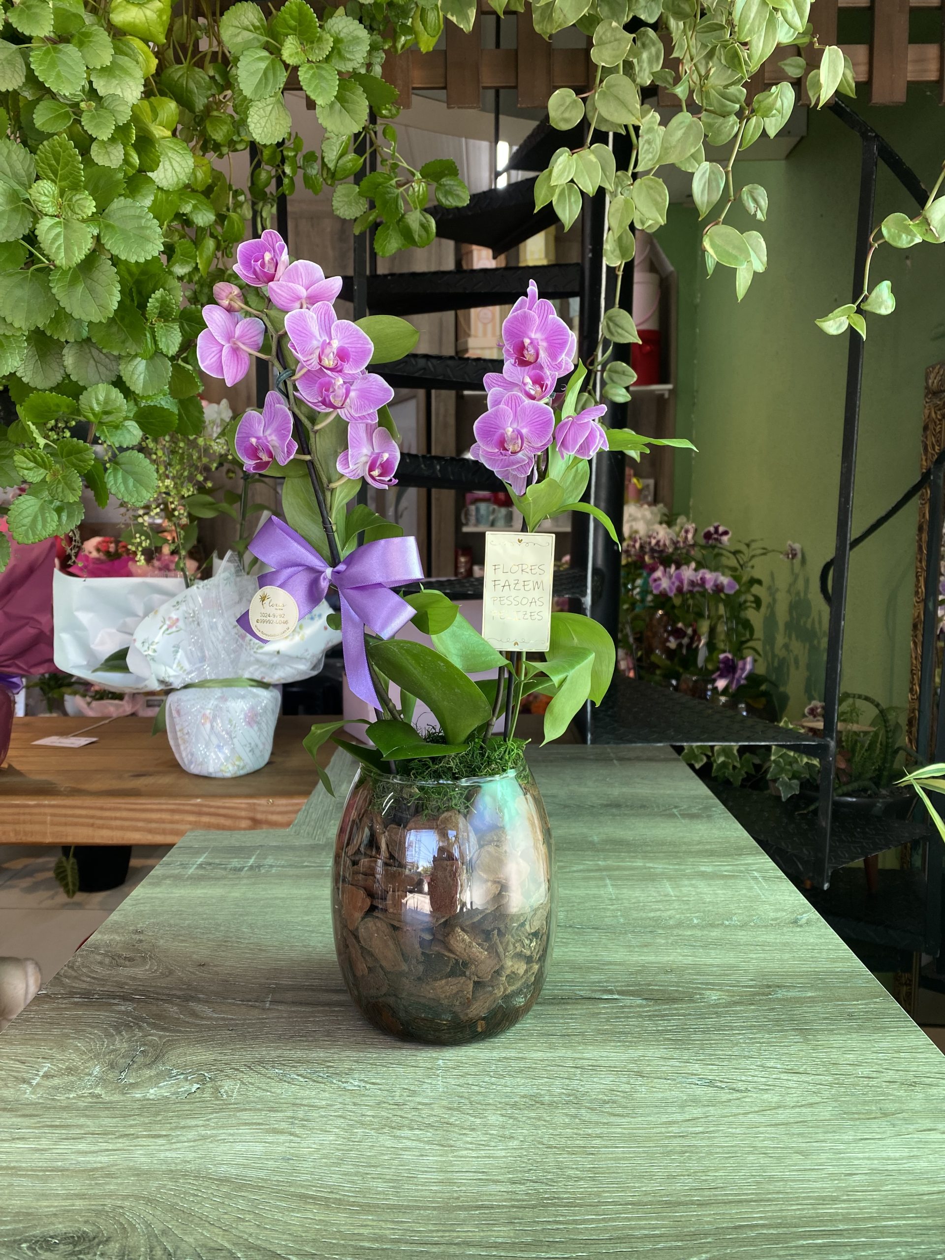 Mini orquídea de duas hastes no vaso de vidro. Em média 50cm de altura
